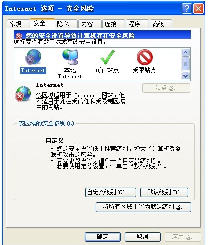 在"安全"的设置里,中间偏下有两个按钮,点击按钮"自定义级别"(Customized)