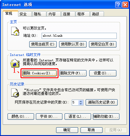 在弹出的Internet选项框,第一步先选择删除Cookies